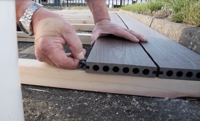 - Now, push the first decking board so that the starter clips fit into its side groove and ensure that the board us pushed tightly secured.
